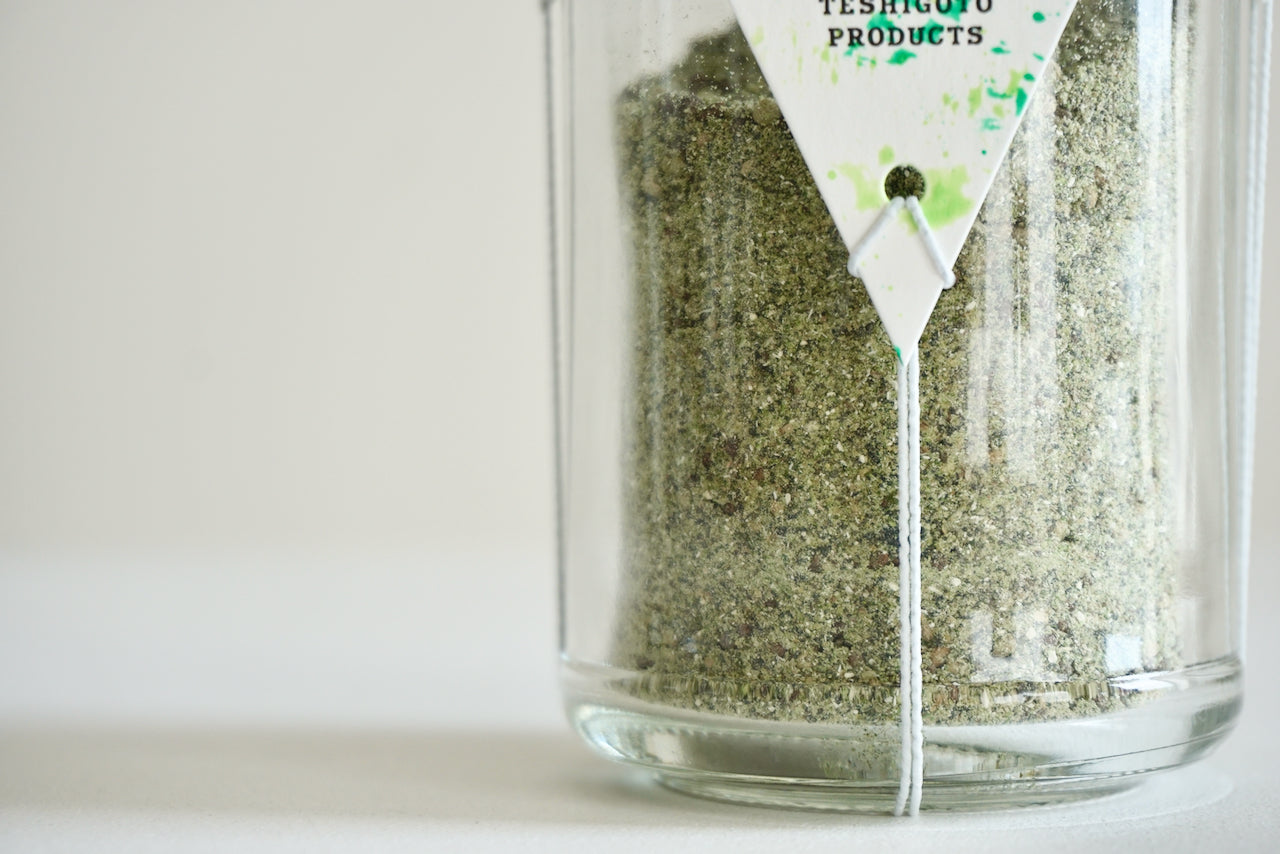 ふりかけの原材料はゆいま~る搾油工房さんが農薬・肥料を使わずに佐久市の森で育てたエゴマやゴマ、Permaculture MochizukiのNickさんが育てた原木椎茸、シーベジタブルの高知県産のすじ青のりをベースに、Nickさんのスギナパウダーが入っています。