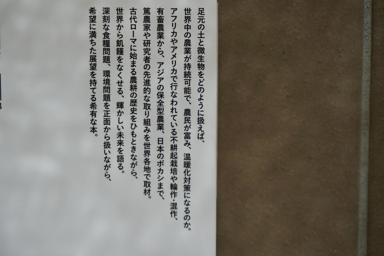 さて、本書『土・牛・微生物ー文明の衰退を食い止める土の話』はまさしくこうした経験のスケールを大きくして論じた一冊だ。土は微生物と植物の根が耕していた――文明の象徴である犂やトラクターを手放し、微生物とともに世界を耕す、土の健康と新しい農業をめぐる物語がここに詰まっている。