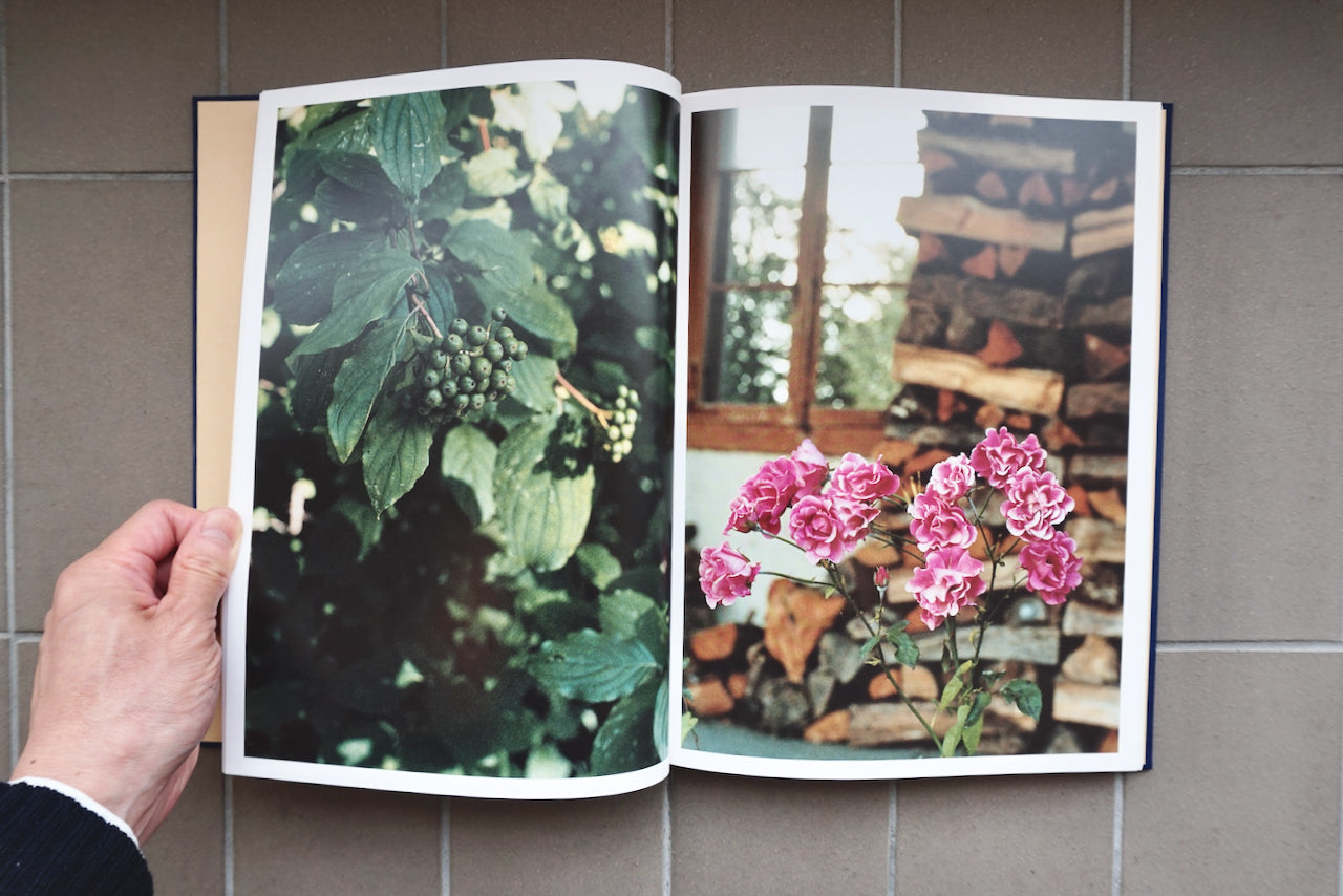 これらの写真は、長島の亡くなった祖父の家から見つかった、25年ほど前に祖母が撮影し、箱に大切にしまっておいた花の写真にインスパイアされたもので、Village Nomadeの敷地内の草花や、部屋の光景、伴っていた息子などが写されている。 また、スイスの澄んだ空気の中で生まれた写真と言葉をそのまま束ねたスクラップブックのように、写真ページ、テキストページ、クラフトペーパーがランダムに綴じられ、 航空券のしおりやメモ書きも挟み込まれる。
